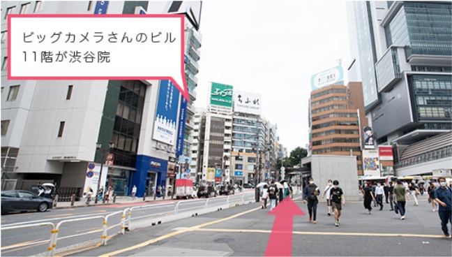 横断歩道を渡り、ビックカメラ渋谷東口店さん 1階のエレベーターで11階までお上がりください。