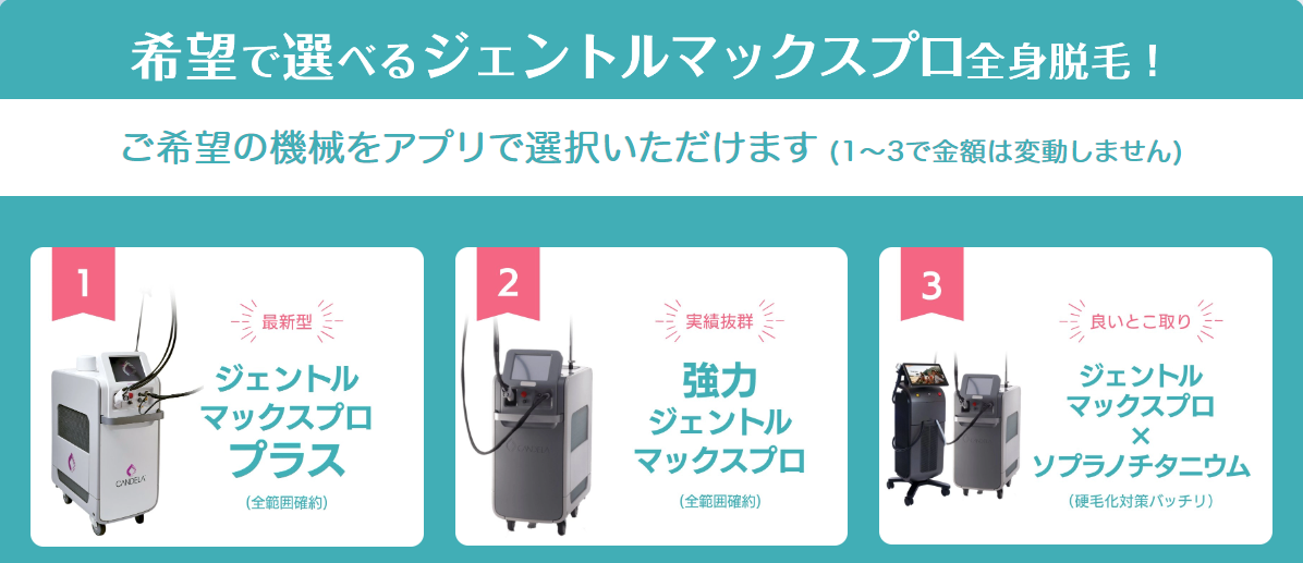 さらに当院では、「希望で選べるジェントルマックスプロ全身脱毛」のプランであれば、追加料金なしで、3つの脱毛機からご希望の機械を選択いただけます。