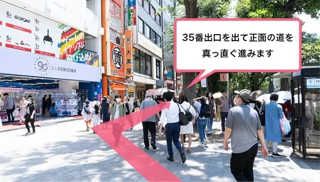 35番出口から地上に出て正面の道を真っ直ぐ進みます。